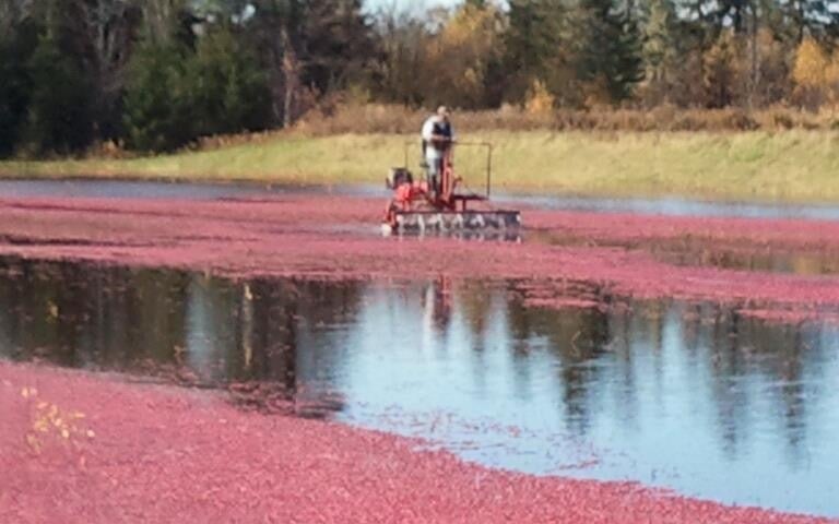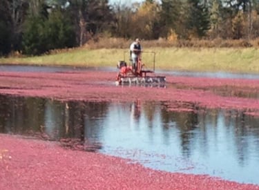 Cranberry harvesting involves collecting cranberries off of the cranberry vines from our bogs using fresh (dry) and water harvesting methods. Fresh fruit harvest is for cranberries to be sold as fresh fruit (bagged cranberries ) and water-harvested cranberries are sent to a fruit processor to IQF (individually quick freeze) for value-added products for ingredients, sweetened dried cranberries, etc.